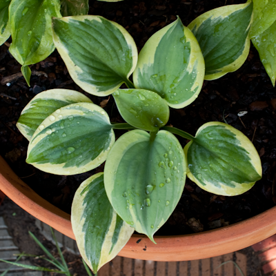 Тетраплоидный спорт от "Secret Love". "Припудренные" голубоватые листья с широким желтым краем, который становиться кремовым к середине лета.